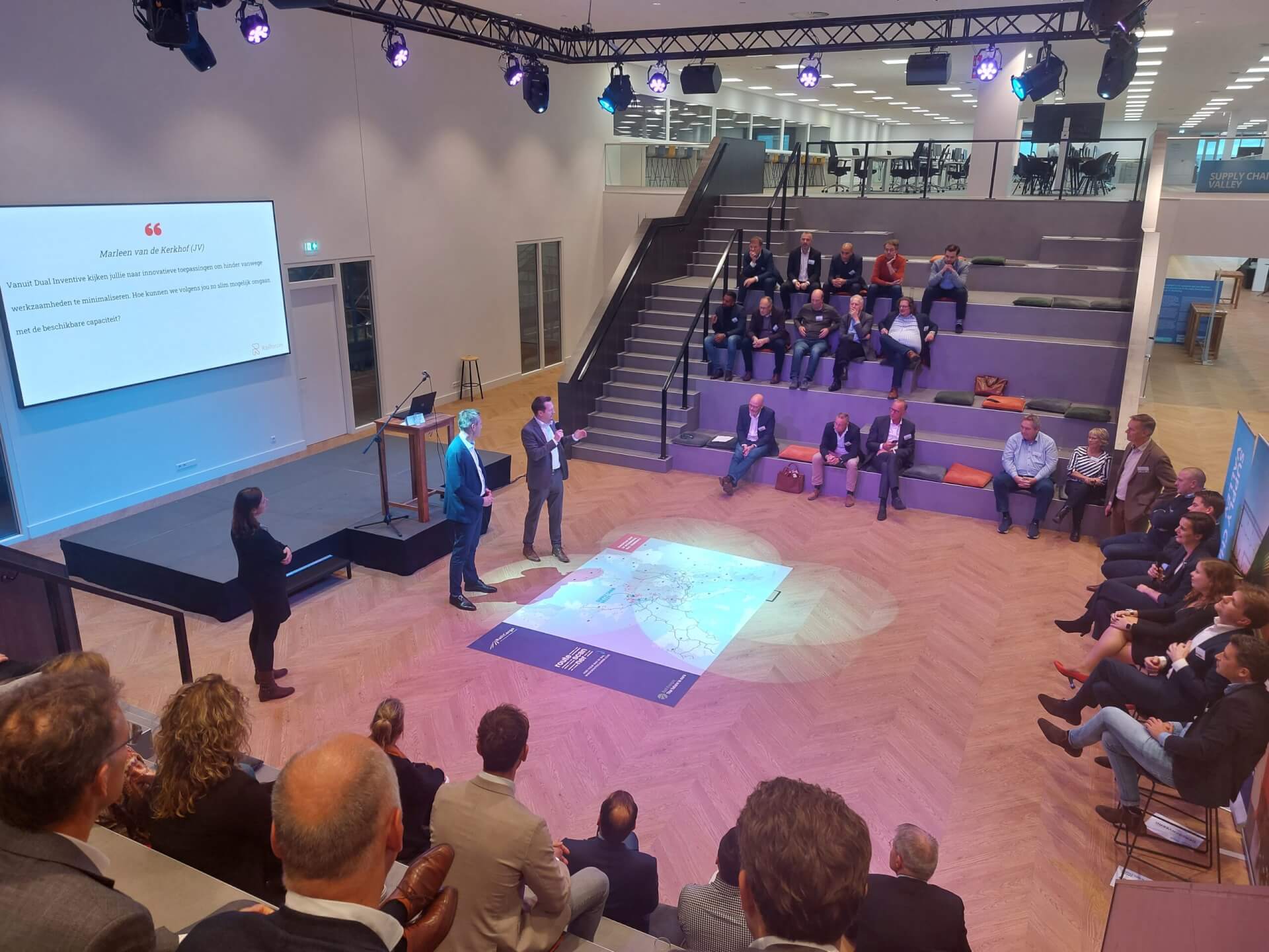 De dagvoorzitters Caroline Koiter en Peter Boom heetten ieder van harte welkom bij de geweldige locatie van Supply Chain Valley in Sevenum. Na de introductie begon het inhoudelijk deel van de bijeenkomst. Peter Pardoel en Daniel ten Ham gaven toelichting op de vele ontwikkelingen in Limburg met name bij het goederenvervoer. Rik Poulus en Peter Boom presenteerden het onderzoek naar synergie in capaciteitsbenutting voor reizigers- en goederenvervoer. Dé manier om goederen- en personenvervoer te koppelen!? Pieter-Jaap Zijlstra kon hierbij concrete voorbeelden vanuit verschillende modaliteiten toelichten.