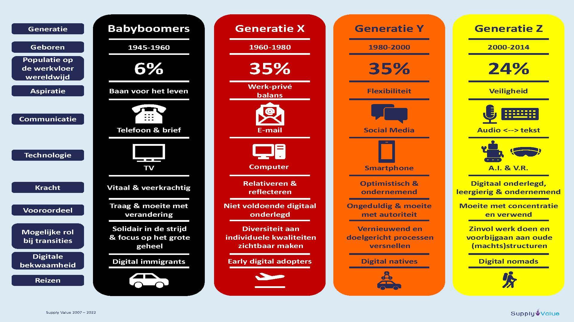 In de railsector werken zowel babyboomers (1946-1960), generatie X (1960-1980), generatie Y (1980-2000) als generatie Z (2000-2014) vol passie aan beter openbaar en spoorvervoer. Elke generatie heeft typische kenmerken en eigen krachten en zwakten. Om samen impact te kunnen maken in de wereld van ov is inzicht in deze kenmerken, krachten en zwakten essentieel.